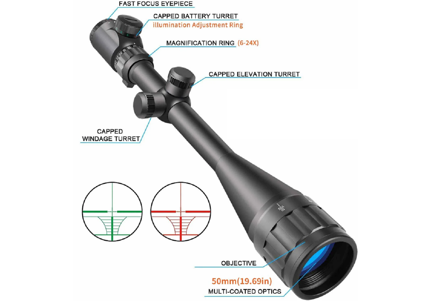 • Κόκκινο, πράσινο και μπλε φωτιζόμενο σταυρόνημα Mil-Dot, μαζί με αυτόματη απενεργοποίηση για εξοικονόμηση μπαταρίας.