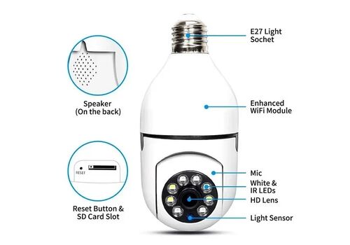 Ανάλυση: HD 1080P με νυχτερινή όραση Εγκατάσταση: Ε27 για εύκολη εγκατάσταση Ήχος: Αμφίδρομη ενδοεπικοινωνία για άμεση επικοινωνία Περιστροφή: 360° για πλήρη θέαση Αποθήκευση: Συμβατό με microSD κάρτα (δεν περιλαμβάνεται)